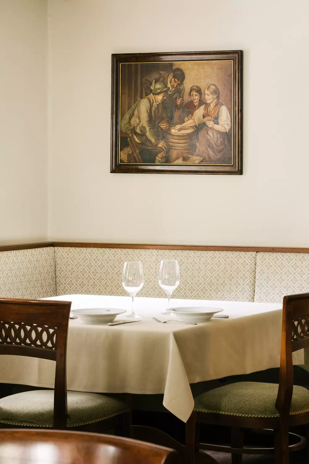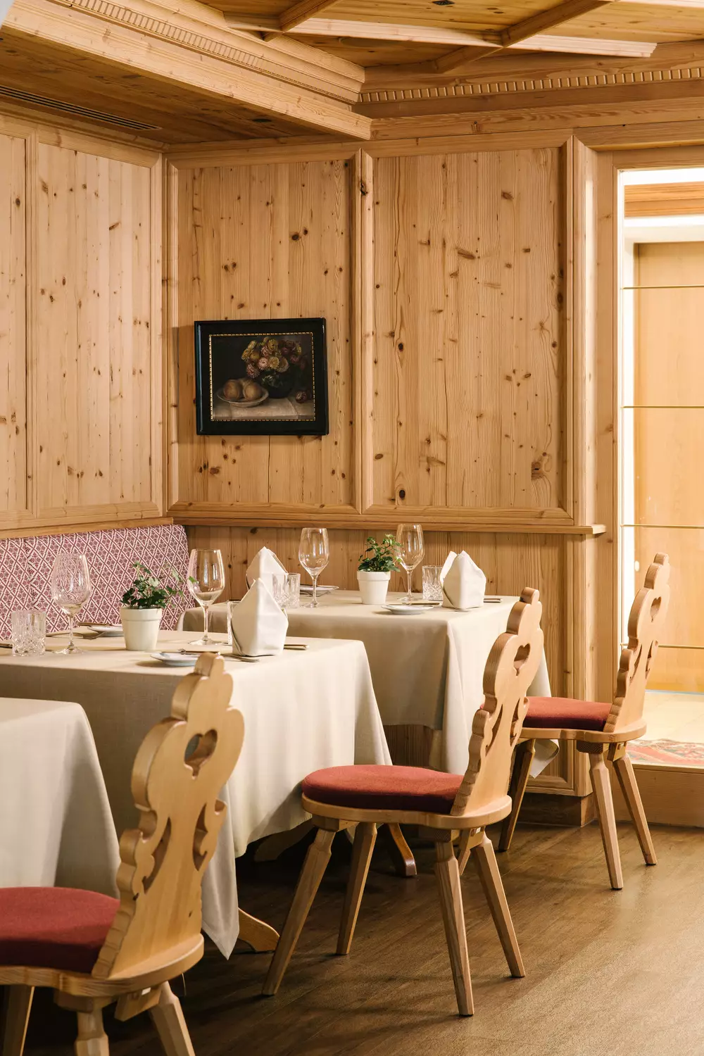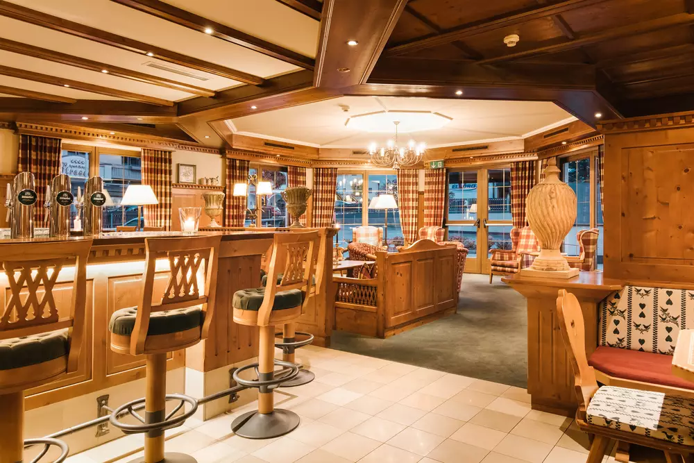 Das Bräu Stüberl war früher die Bräu Stube und ist ganz in wertvolles Zirbenholz gekleidet. Die Bänke sind mit Ornamenten verziert.