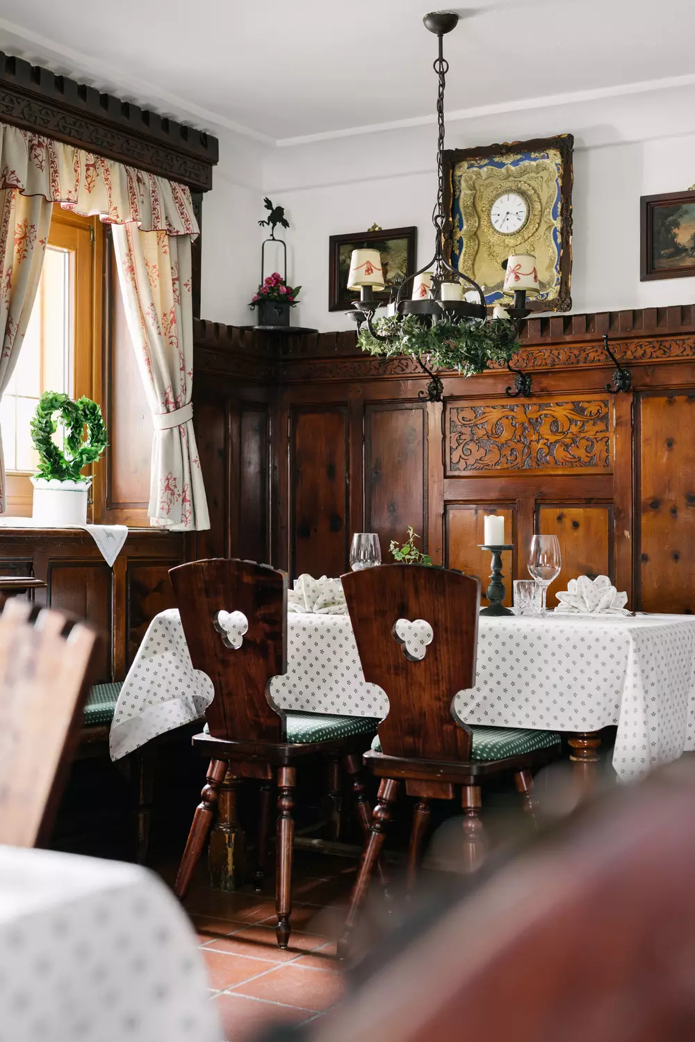 Das Speisezimmer ist unser prächtigster Raum mit schönster Täfelung und Schnitzereien mit kunstvollen Vogelmotiven. Auch auf den Kacheln des herrlichen Kachelofens findet sich dieses Motiv.